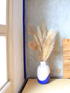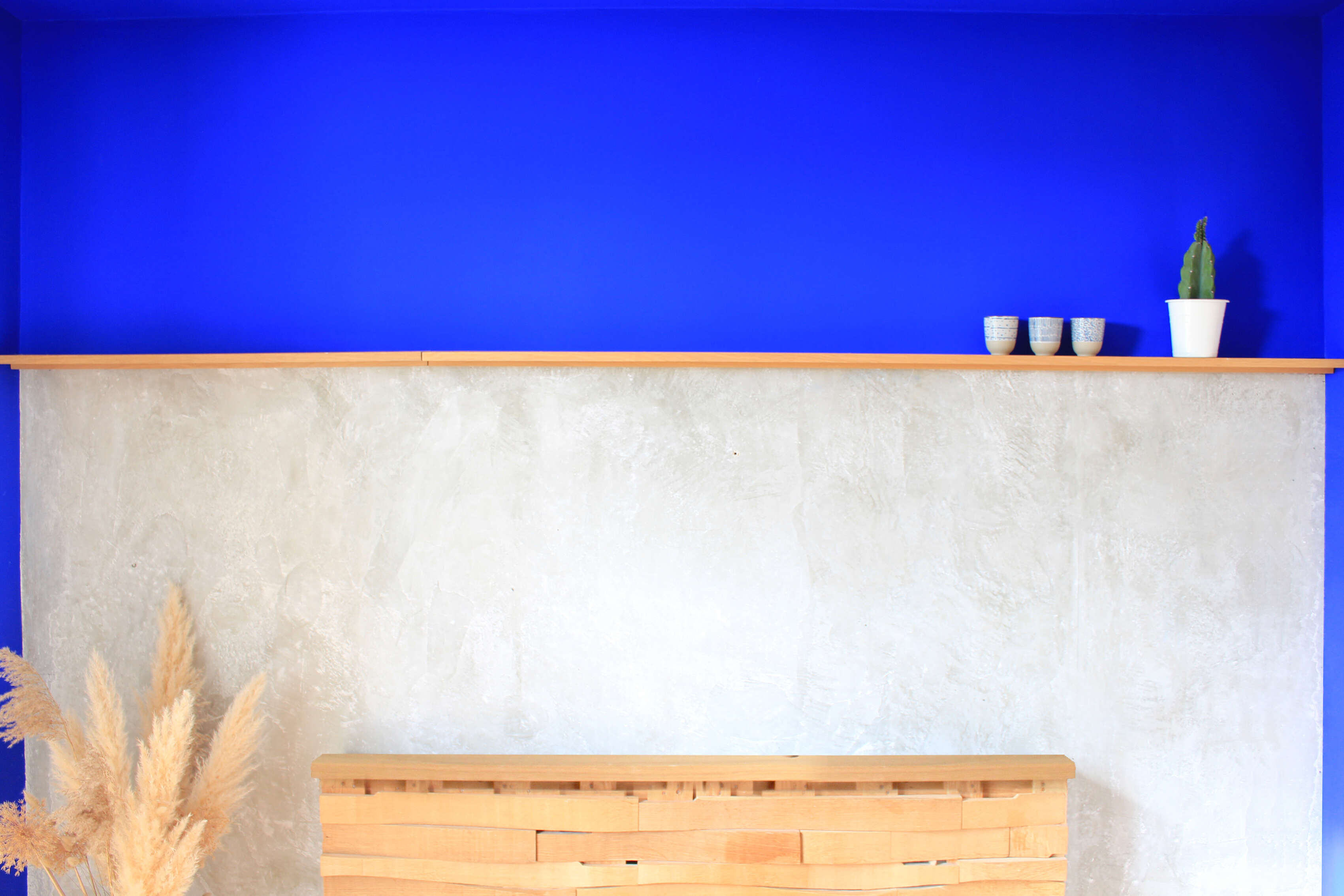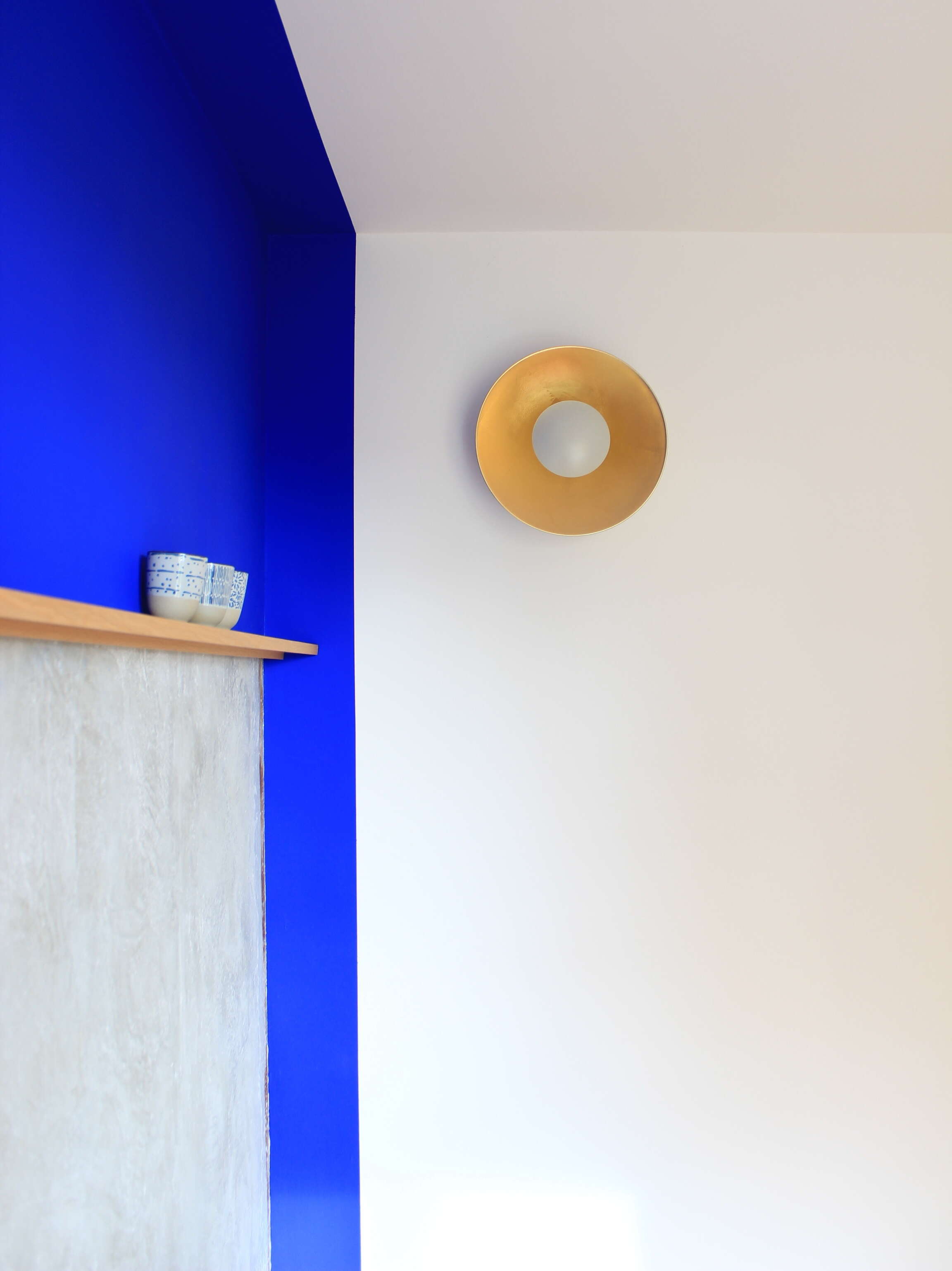Conçue sur mesure, la tête de lit née d’une opportunité de réemploi de chutes de chêne massif lors de la fabrication des pieds de consoles Louis XV destinées à être jetés. Ces négatifs d’une pièce de meuble classique mis bout à bout forme une pièce singulière contre laquelle s’adosser. La profondeur de la peinture, au pigment pur bleu Klein, participe à la composition en formant une alcove par son graphisme. L’association avec un blanc pur n’est pas sans rappeler des inspirations méditerranéennes. Cet espace de sommeil convoque ainsi un voyage au travers de clin d’œil de cultures métissées.