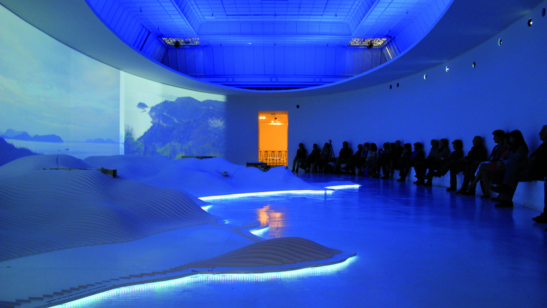 Ces vides semblent dématérialiser l'île pour une plus grande mise en valeur des sept maquettes des bâtiments construits par les étudiants.