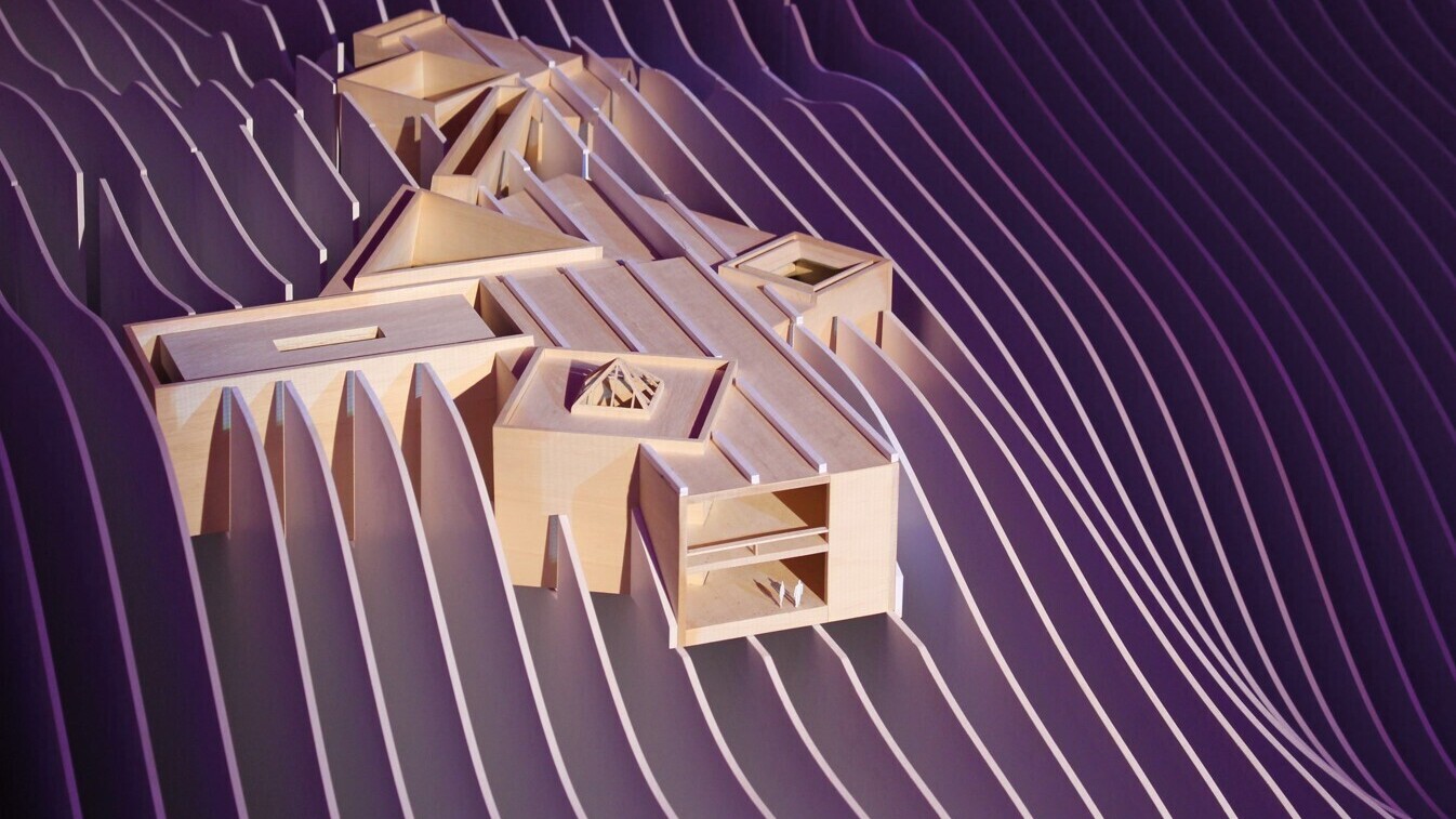 L'île qui abrite les maquettes des bâtiments de Tadao Ando, prend forme par l’accumulation de strates verticales espacées de manière régulière.