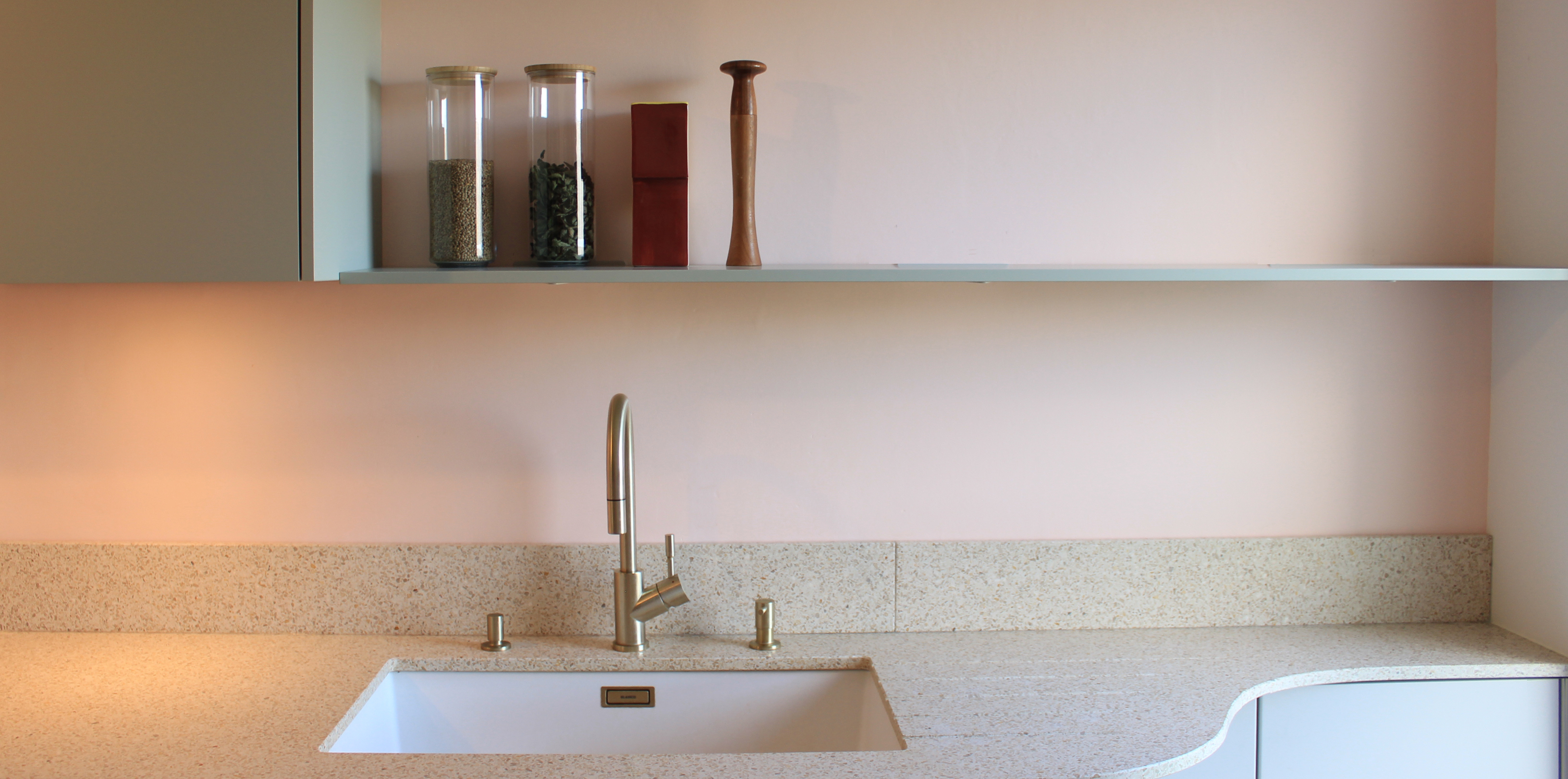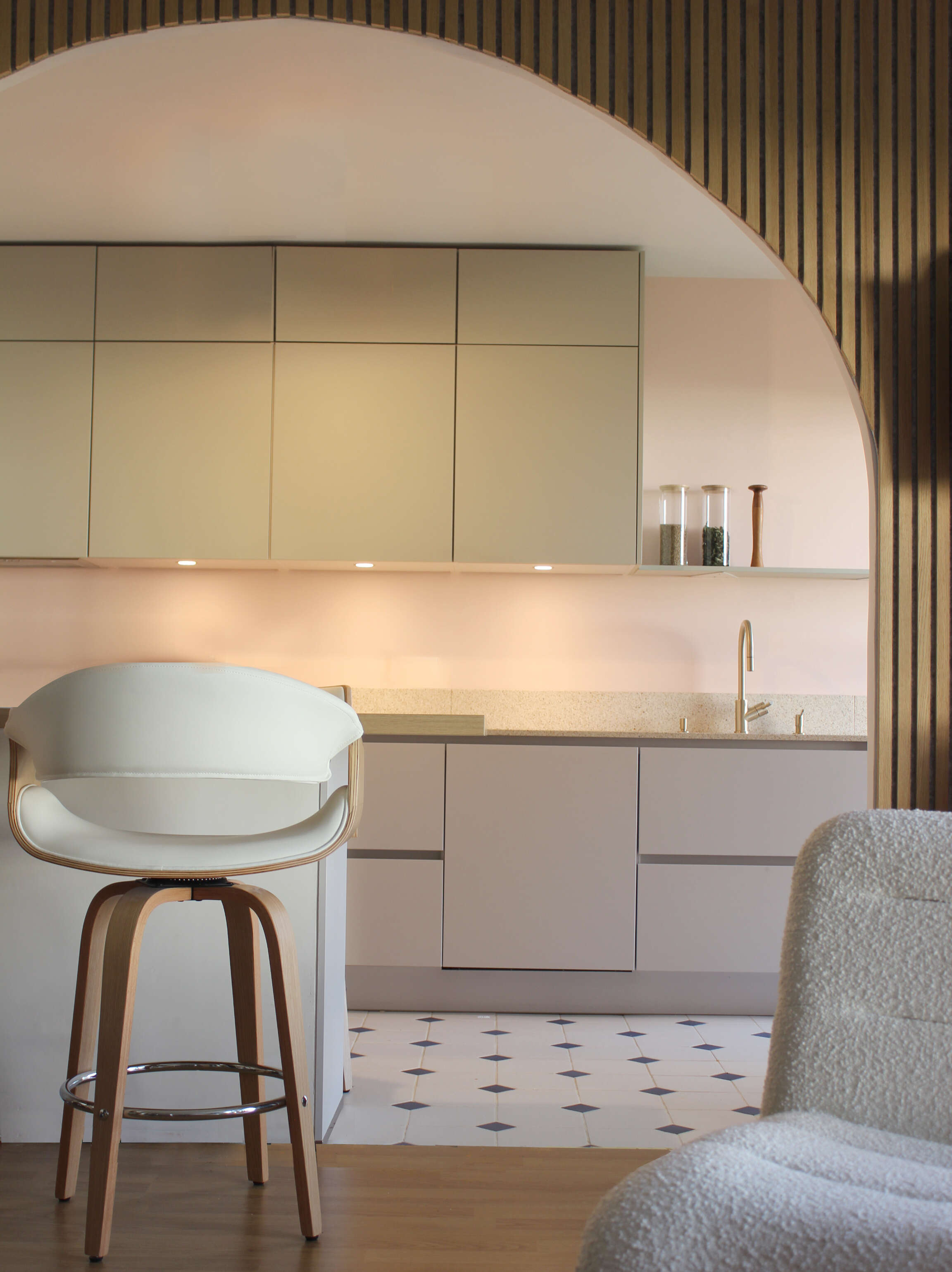 La cuisine existante, malgré une surface au sol généreuse, manquait d’optimisation. L’ouverte de la cloison permet de quitter la disposition existante en couloir pour un ilot central à cheval sur la cloison.