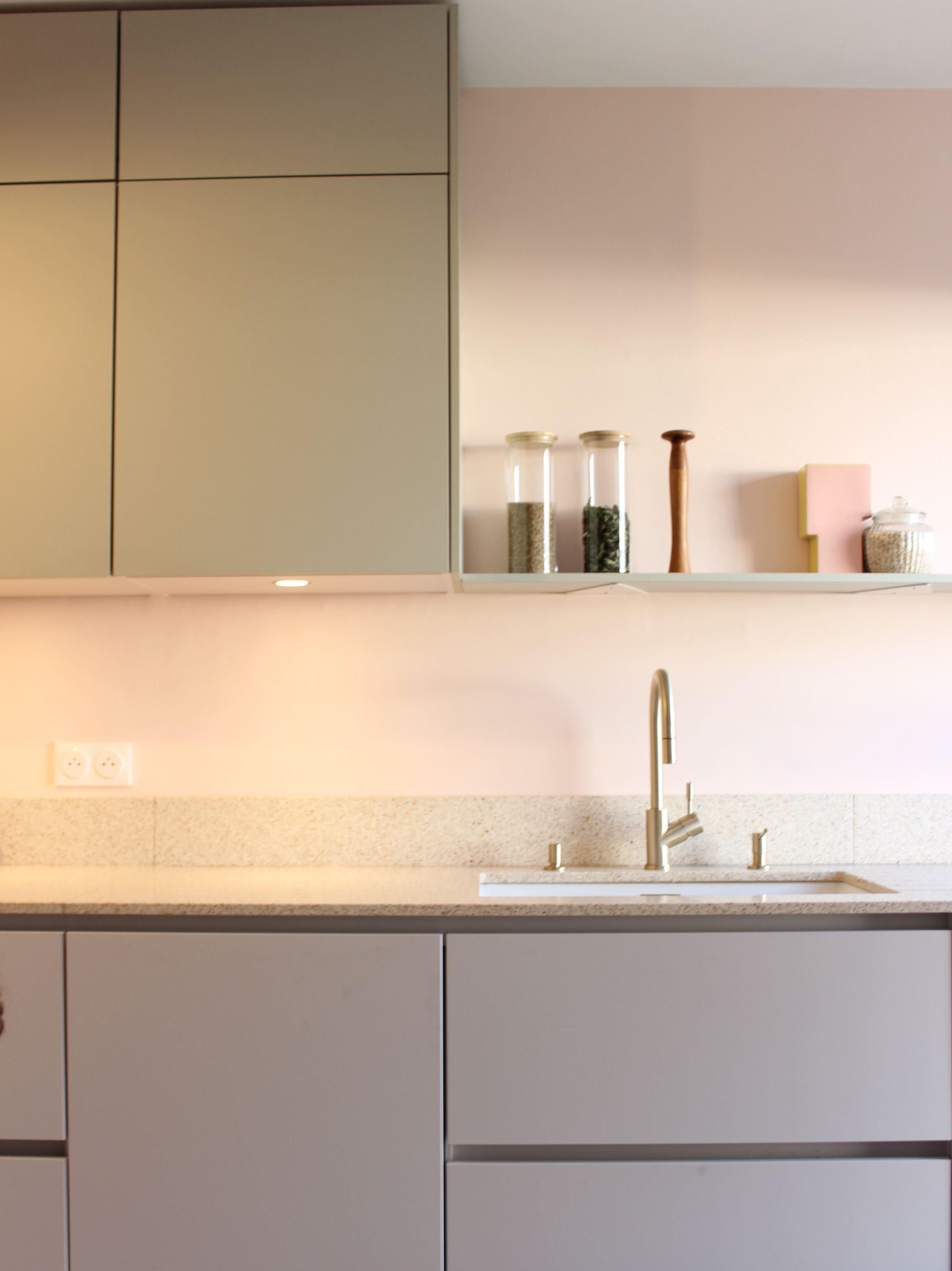 La disposition en « L » de la cuisine permet de dissimuler la gaine technique à l’angle de la pièce et d’épurer ainsi les volumes. L’ensemble des colonnes sont centralisées sur un même côté formant un mur menuisé.
