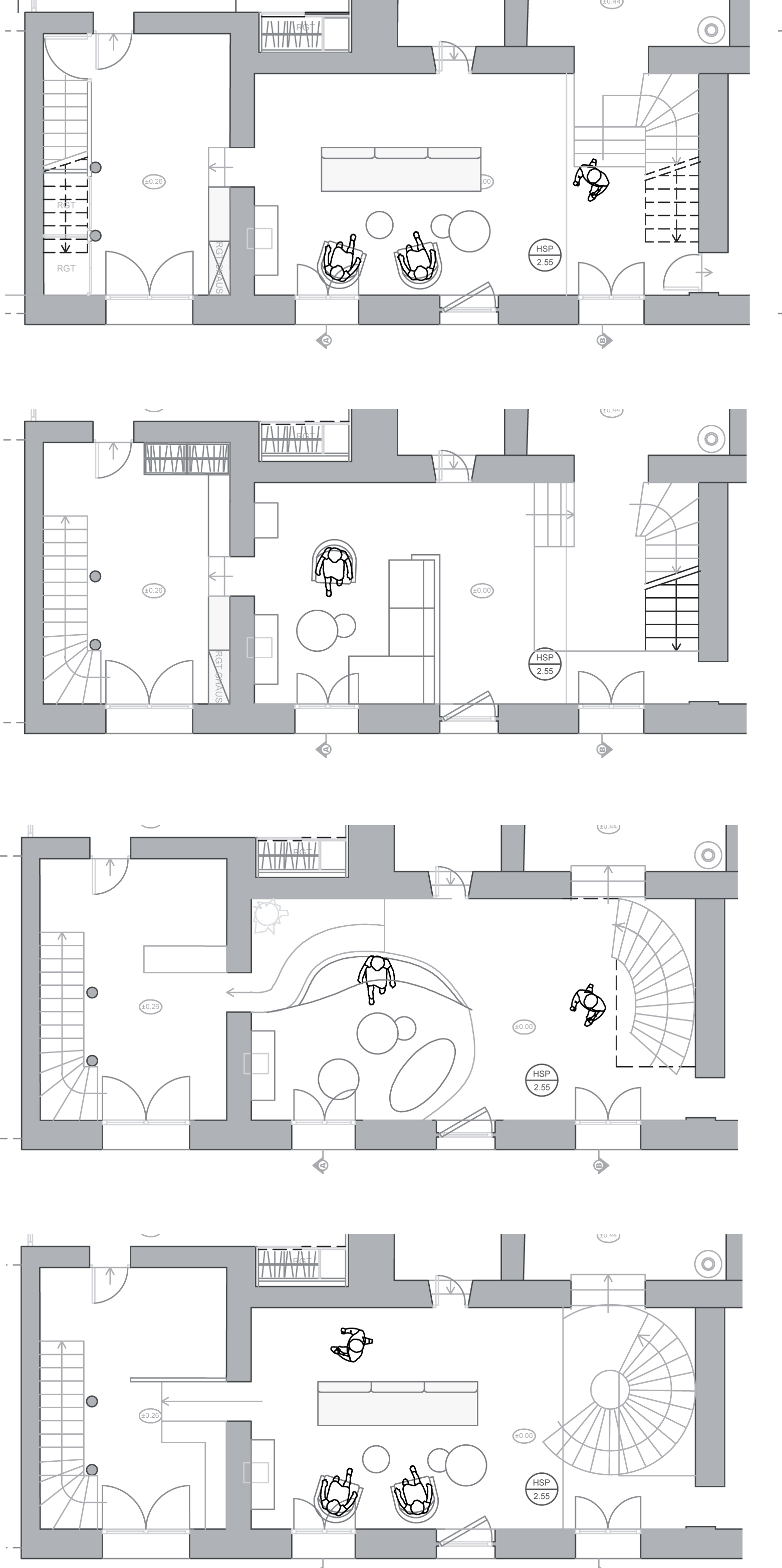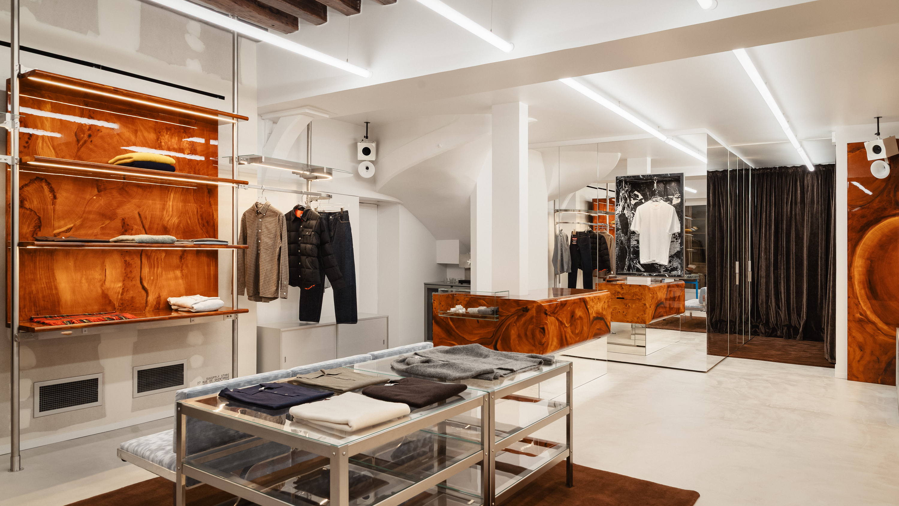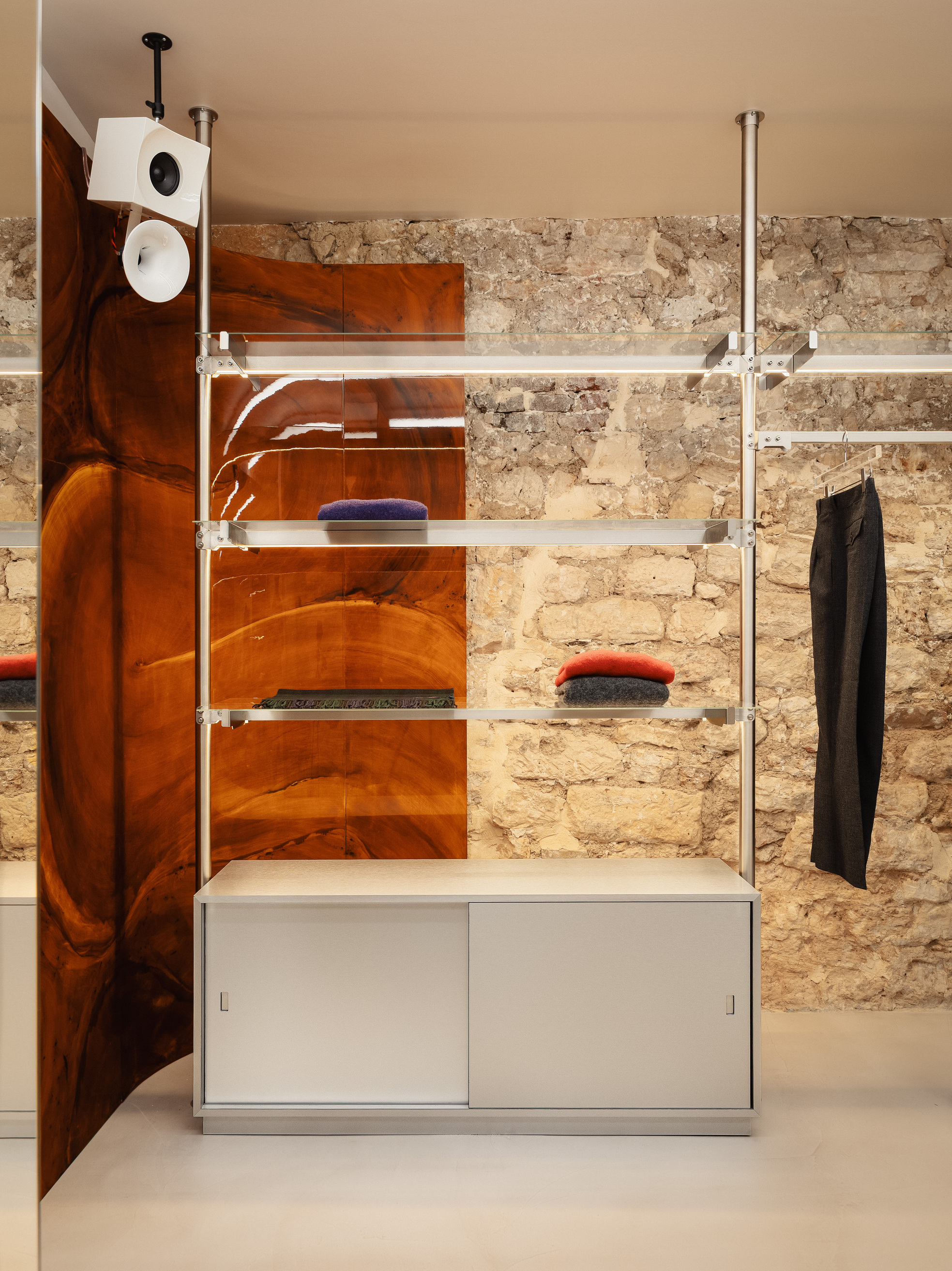 C’est une rencontre entre l’enveloppe brut et le mobilier sophistiqué. Le projet met à nu la structure du bâtiment en révélant le mur en pierre, caché derrière des plaques de plâtre, et dont les aspérités témoignent de l’histoire des différentes interventions passées. Les structures métalliques brossées et aux assemblages visibles, dialoguent avec les surfaces lisses et brillantes du bois-feint. A s’y méprendre, l’artiste néerlandaise Lotte Schoots, inspirée du bois de loupe, réinvente par son geste picturale le motif qui parcourt les trois dimensions. Un équilibre audacieux entre matières nobles et finitions brut. A l’inverse du challenge habituel pour la maitrise d’œuvre d’exécution de dissimuler les éléments techniques, ici le mot d’ordre est de les assumer. Ils participent à la composition. Rien n’est laissé au hasard. La curation des quelques pièces non conçues sur mesure telle que les enceintes ou les assises s’inscrivent dans l’approche de Suuupply pour la sélection de ces produits.
